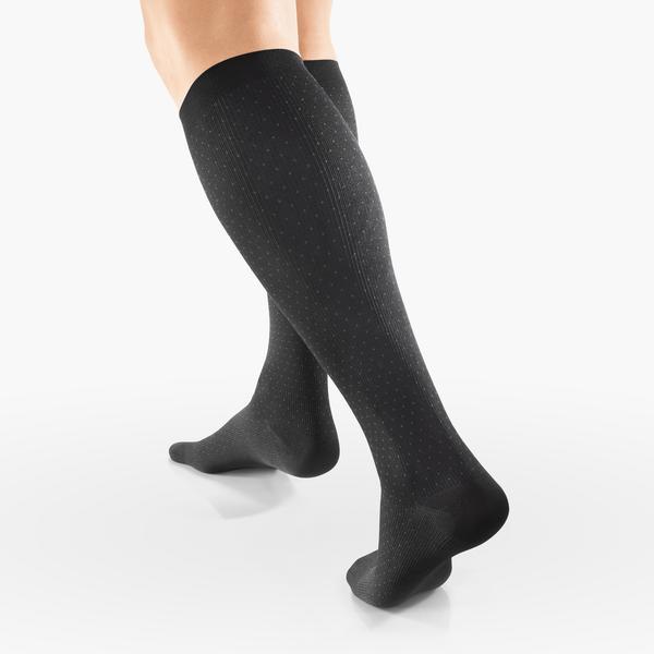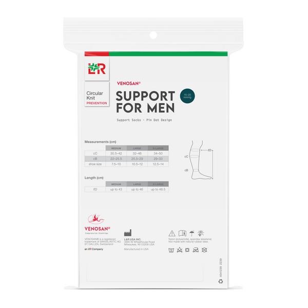 VENOSAN® Support For Men, Pin Dot Design are subtle patterned compression socks designed for men to provide everyday support during business travel and long periods of standing/sitting. Its robust, durable design and wide top band withstands all day wear.